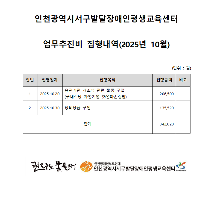 2025년 10월 업무추진비 사용내역 공개 페이지 정보 작성자 최고관리자 작성일 25-10-31 09:42 조회 63회 댓글 0건 본문 센터 운영의 공정성과 투명성을 기하고자 10월 업무추진비 사용내역을 공개합니다. 이전글 다음글 목록