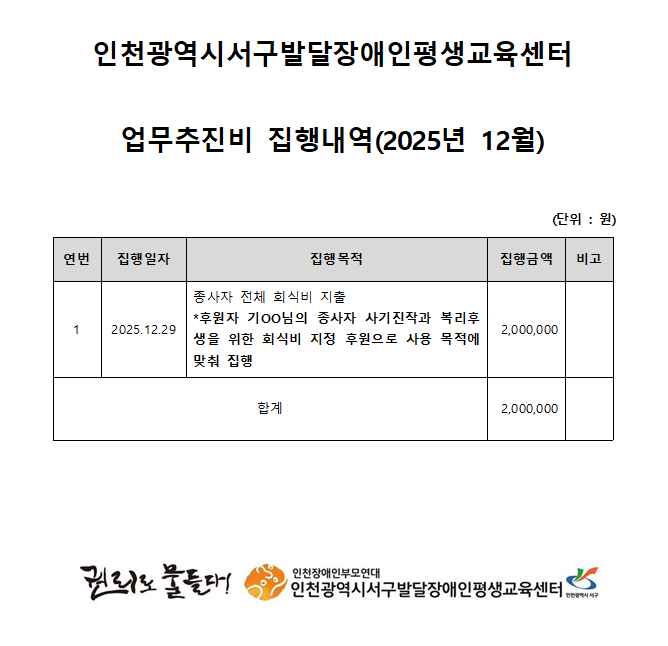 2025년 12월 업무추진비 사용내역 공개 페이지 정보 작성자 최고관리자 작성일 26-01-05 11:06 조회 11회 댓글 0건 본문 센터 운영의 공정성과 투명성을 기하고자 12월 업무추진비 사용내역을 공개합니다. 다음글 목록