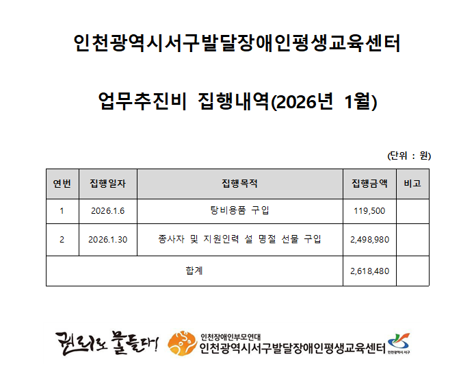 2026년 1월 업무추진비 사용내역 공개 페이지 정보 작성자 최고관리자 작성일 26-02-02 14:22 조회 63회 댓글 0건 본문 센터 운영의 공정성과 투명성을 기하고자 1월 업무추진비 사용내역을 공개합니다. 이전글 다음글 목록
