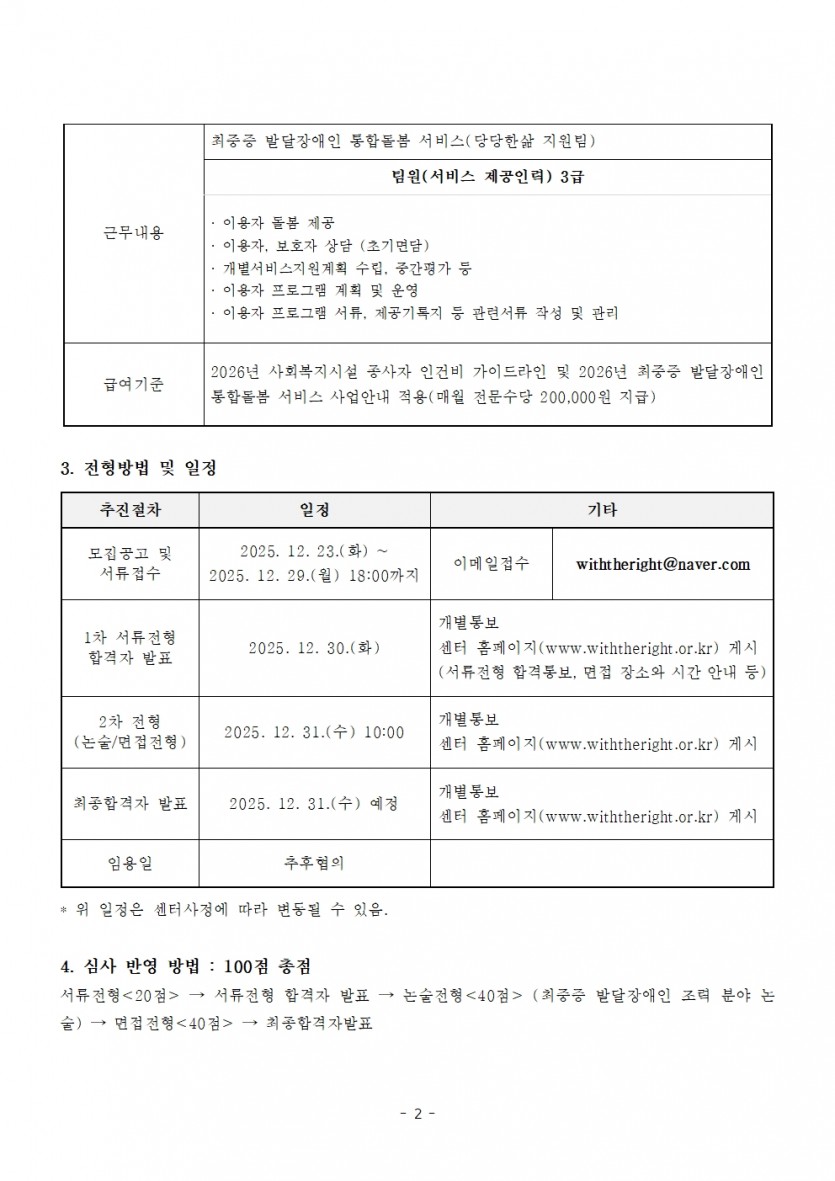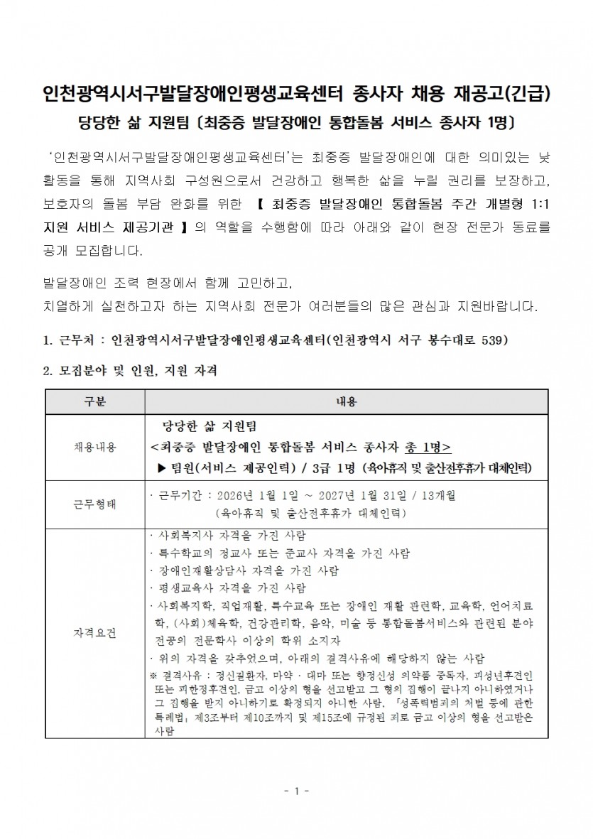 [긴급]종사자 채용 재공고(최중증 발달장애인 통합돌봄 주간 개별형 1:1지원 서비스 종사자_출산전후휴가 및 육아휴직 대체인력) 페이지 정보 작성자 최고관리자 작성일 25-12-23 15:36 조회 36회 댓글 0건 첨부파일 파일 붙임_긴급종사자채용공고문통합돌봄서비스 지원인력_인천광역시서구발달장애인평생교육센터_이력서포함.hwp (159.0K) 1회 다운로드 DATE : 2025-12-23 15:38:18 본문 다음글 목록