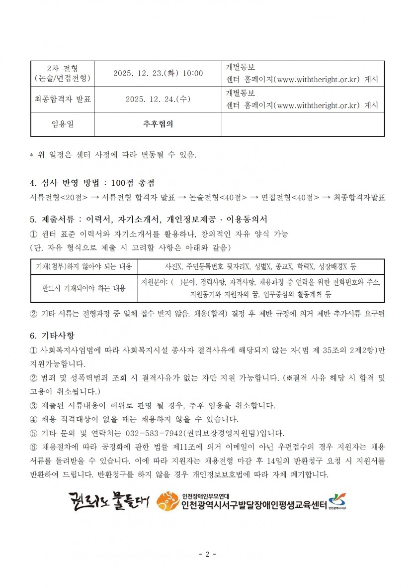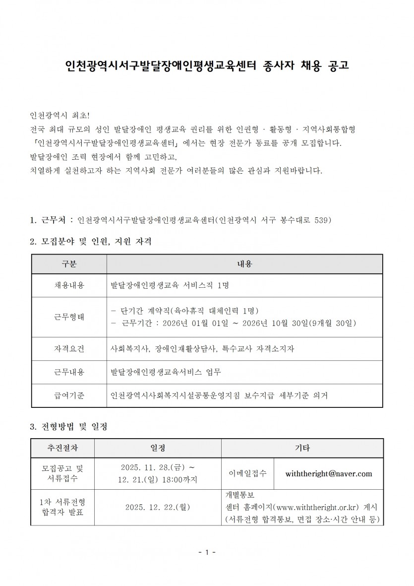 [단기간 계약직]종사자 채용 공고(발달장애인평생교육서비스직_육아휴직 대체인력) 페이지 정보 작성자 최고관리자 작성일 25-11-28 17:09 조회 115회 댓글 0건 첨부파일 파일 종사자채용공고문발달장애인평생교육서비스직_육아휴직 대체인력_인천광역시서구발달장애인평생교육센터_이력서포함.hwp (93.5K) 4회 다운로드 DATE : 2025-11-28 18:44:07 본문 이전글 다음글 목록