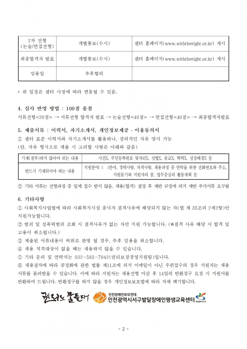 [단기간 계약직]종사자 채용 공고(발달장애인평생교육서비스직_육아휴직 대체인력) 페이지 정보 작성자 최고관리자 작성일 26-02-24 13:23 조회 201회 댓글 0건 첨부파일 파일 종사자채용공고문발달장애인평생교육서비스직_육아휴직 대체인력_인천광역시서구발달장애인평생교육센터_이력서포함.hwp (89.5K) 9회 다운로드 DATE : 2026-02-24 13:23:55 본문 [이 게시물은 최고관리자님에 의해 2026-03-10 13:53:10 공지사항에서 이동 됨] 이전글 다음글 목록