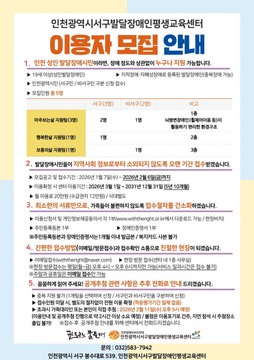 2026년 이용자 모집 안내 페이지 정보 작성자 최고관리자 작성일 26-01-07 14:40 조회 245회 댓글 0건 첨부파일 파일 2026 서발평 이용자 모집 안내문 첨부서류.hwp (142.5K) 5회 다운로드 DATE : 2026-01-07 14:40:35 본문 다음글 목록