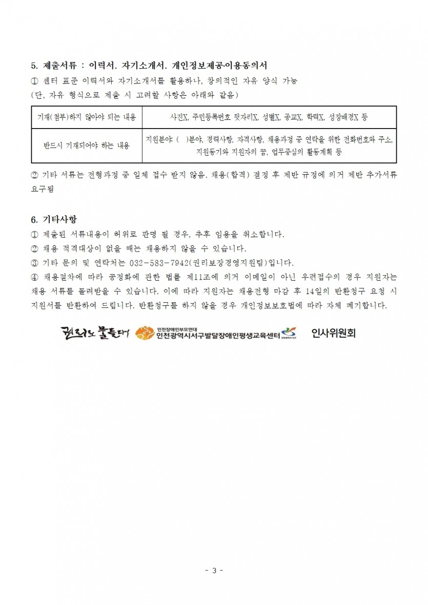 [긴급]종사자 채용 재공고(최중증 발달장애인 통합돌봄 주간 개별형 1:1지원 서비스 종사자_출산전후휴가 및 육아휴직 대체인력) 페이지 정보 작성자 최고관리자 작성일 25-12-23 15:36 조회 52회 댓글 0건 첨부파일 파일 붙임_긴급종사자채용공고문통합돌봄서비스 지원인력_인천광역시서구발달장애인평생교육센터_이력서포함.hwp (159.0K) 2회 다운로드 DATE : 2025-12-23 15:38:18 본문 다음글 목록