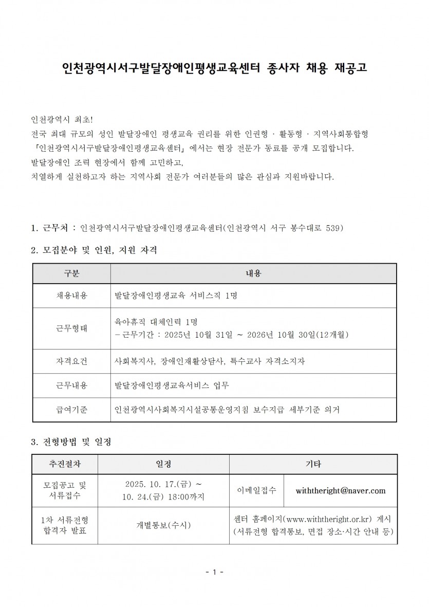 [긴급]종사자 채용 재공고(발달장애인평생교육서비스직_육아휴직 대체인력) 페이지 정보 작성자 최고관리자 작성일 25-10-17 18:25 조회 121회 댓글 0건 첨부파일 파일 종사자채용공고문발달장애인평생교육서비스직_육아휴직 대체인력_인천광역시서구발달장애인평생교육센터_이력서포함.hwp (150.0K) 9회 다운로드 DATE : 2025-10-17 18:25:23 본문 이전글 다음글 목록