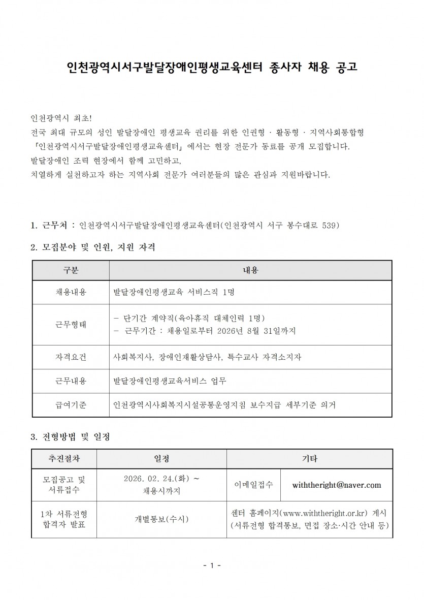 [단기간 계약직]종사자 채용 공고(발달장애인평생교육서비스직_육아휴직 대체인력) 페이지 정보 작성자 최고관리자 작성일 26-02-24 13:23 조회 109회 댓글 0건 첨부파일 파일 종사자채용공고문발달장애인평생교육서비스직_육아휴직 대체인력_인천광역시서구발달장애인평생교육센터_이력서포함.hwp (89.5K) 4회 다운로드 DATE : 2026-02-24 13:23:55 본문 이전글 다음글 목록