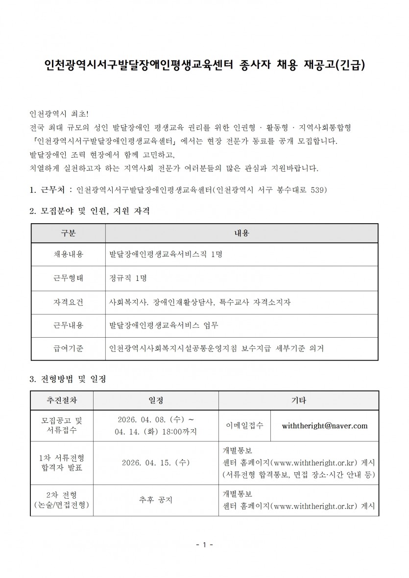 [긴급]종사자 채용 재공고(발달장애인평생교육서비스직) 페이지 정보 작성자 최고관리자 작성일 26-04-08 15:00 조회 198회 댓글 0건 첨부파일 파일 종사자채용공고문발달장애인평생교육서비스직_인천광역시서구발달장애인평생교육센터_이력서포함.hwp (155.0K) 12회 다운로드 DATE : 2026-04-08 15:00:04 본문 [이 게시물은 최고관리자님에 의해 2026-04-15 10:30:49 공지사항에서 이동 됨] 다음글 목록